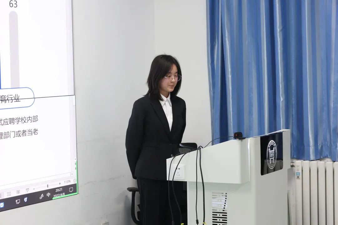 在主持人宣读完比赛流程与规则后,比赛正式开始,六名选手依次上台展示,分别从当前专业学习和职业之间的关系、职业探索、自我探索、职业定位和行动计划等方面进行PPT的展示与自我陈述。选手们在个人陈述过程中对于自身能力的认识、对于未来的规划能力得到了充分展现,体现出了高工学子的自信和生涯规划能力。在每位选手展示完毕后,由评委提问与打分,并对选手的表现进行点评与建议。