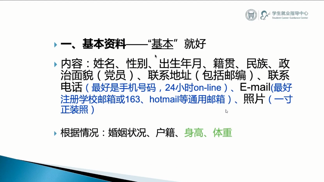 李婷认为基本信息“基本”就好,强调联系方式务必完整正确,并建议同学们注册学校邮箱或163、hotmail等通用信箱,所留联系电话要24小时在线,以便于及时收到求职反馈信息。