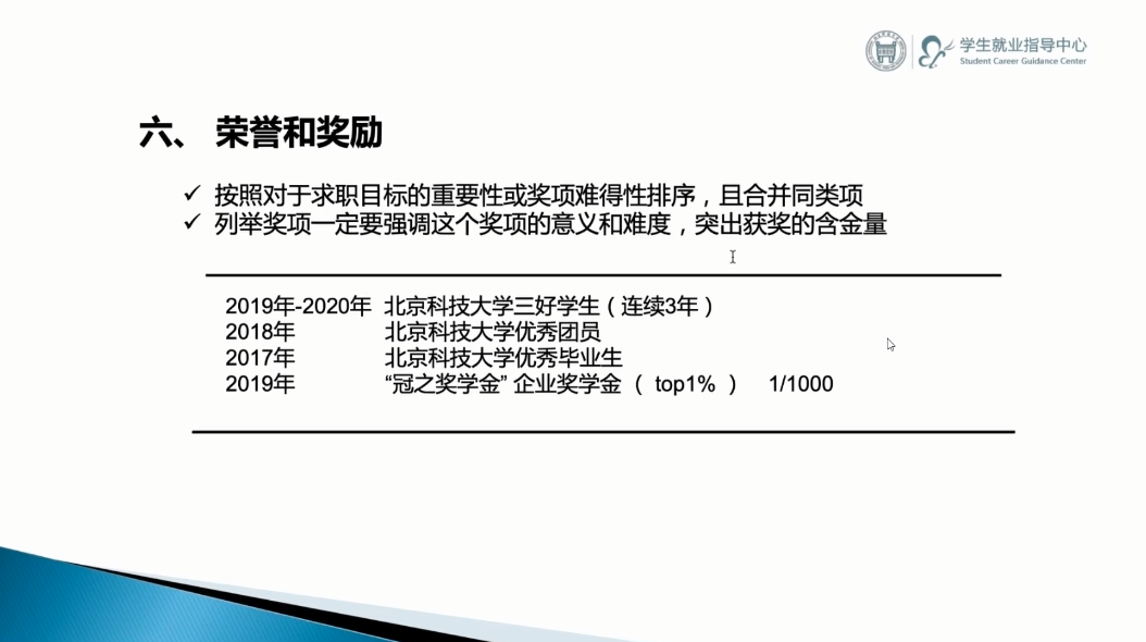 最后,李婷鼓励同学们积极与就业指导老师沟通,尽力完善简历,使得求职、求学之路更加顺利。至此,北京科技大学“海信杯”第十三届模拟求职大赛高工&化生&能环分站赛线上简历培训会圆满结束。