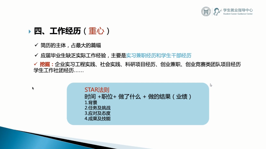李婷强调,工作经历是简历重心,应当占最大的篇幅,内容主要是实习兼职经历和员工干部经历,可根据自身情况深入挖掘,并按照“STAR法则”简明、扼要地叙述。