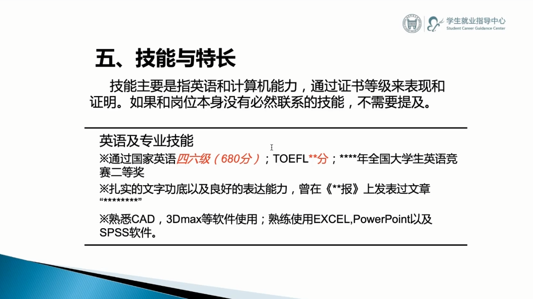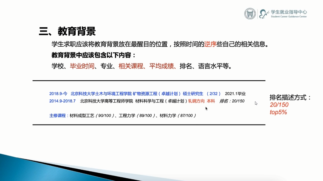 李婷指出要将教育背景放在最醒目的位置,按照时间的逆序写自己的相关信息。同时针对求职意向岗位,灵活选择相关性强的内容进行展示,如专业相关课程、排名、语言水平等。