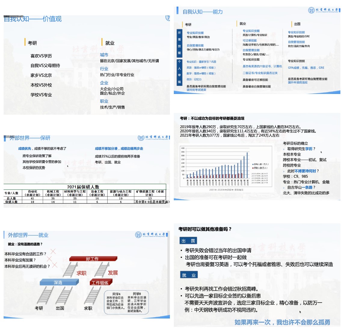 本次指导会的讲解从以下几个方面进行:决策因素,自我认知和外部世界的影响以及个人冲突和就业形势,并且在最后进行了长达了半个小时的答疑解惑时间。