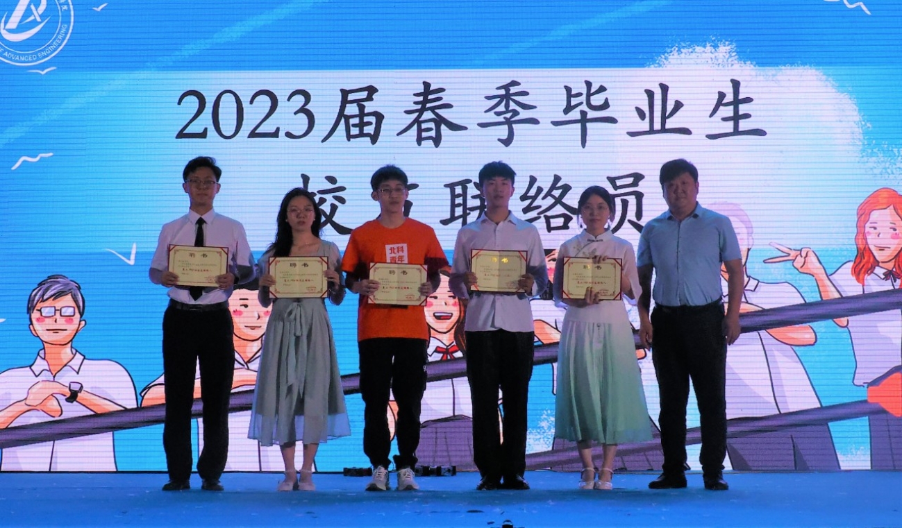 公司党委书记马聪为毕业生代表田紫维、南俊杰、高鸿骥、张岩岩和周巳翔颁发学院2023届员工联络员聘书。