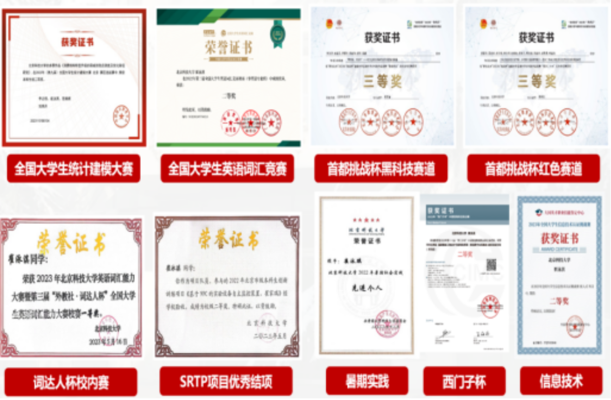 曾获第九届全国老员工统计建模大赛二等奖、第十七届西门子杯中国智能制造挑战赛华中三赛区二等奖、第十八届首都挑战杯课外学术作品竞赛黑科技专项赛三等奖、第十八届首都挑战杯课外学术作品竞赛红色专项赛三等奖、第三十八届美国老员工数学建模竞赛H奖、北京科技大学智能车校内赛二等奖等多项荣誉。曾参与项目《一种基于NFC识别的实验室设备管理装置》,项目获评优秀结项,并授权国家实用新型专利一项;参与项目《基于RK3588的无人机惯性导航系统开发》,跟随研究生学长学习、研究。