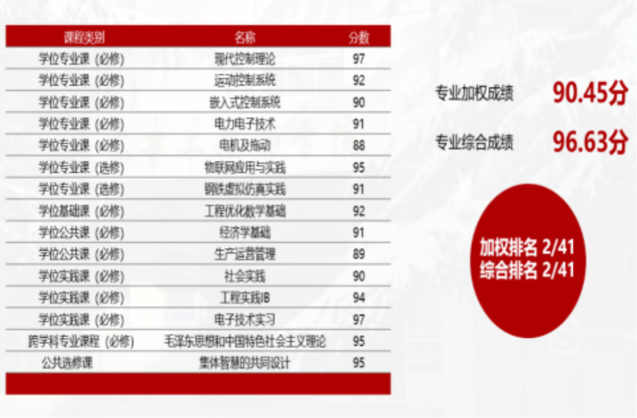 学习方面,本人入学以来学习踏实认真,课上认真听讲,积极做好笔记,课下主动复习,按时完成作业及相关任务。大一学年末,专业进行大类分流,本人选择了竞争较为激烈的自动化专业,并且保持踏实认真的学习态度,成绩保持在较高的水平。本年度,在疫情退去,一片欣欣向荣之际,本人也克服了学习方面的层层乌云,多数专业课程取得90分左右及以上的成绩,最终加权成绩90.45分,综合成绩96.63分,均位列专业第二名。