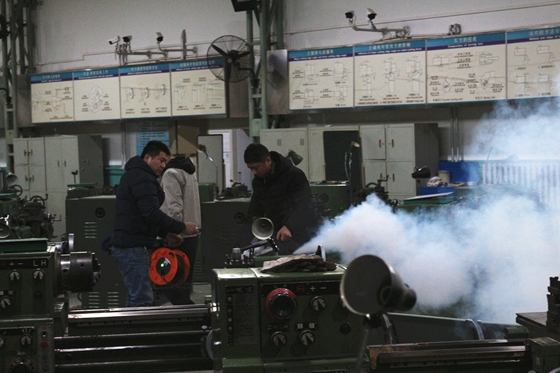 16:40,演习总指挥、williamhill中国官方网站经理赵志毅宣布演习开始,保卫保密处指导人员随即在工程训练中心东区车工实训区放出模拟烟雾,同时响起火灾警报,演习正式开始。全体师生在应急疏散小组的引导下,根据远离火源就近疏散原则由各条安全通道有序撤离,然后在大厂房东侧大门外空地集合。应急疏散小组清点师生人数后向总指挥汇报了人员疏散情况。