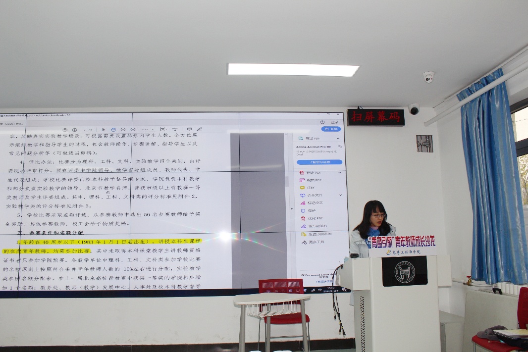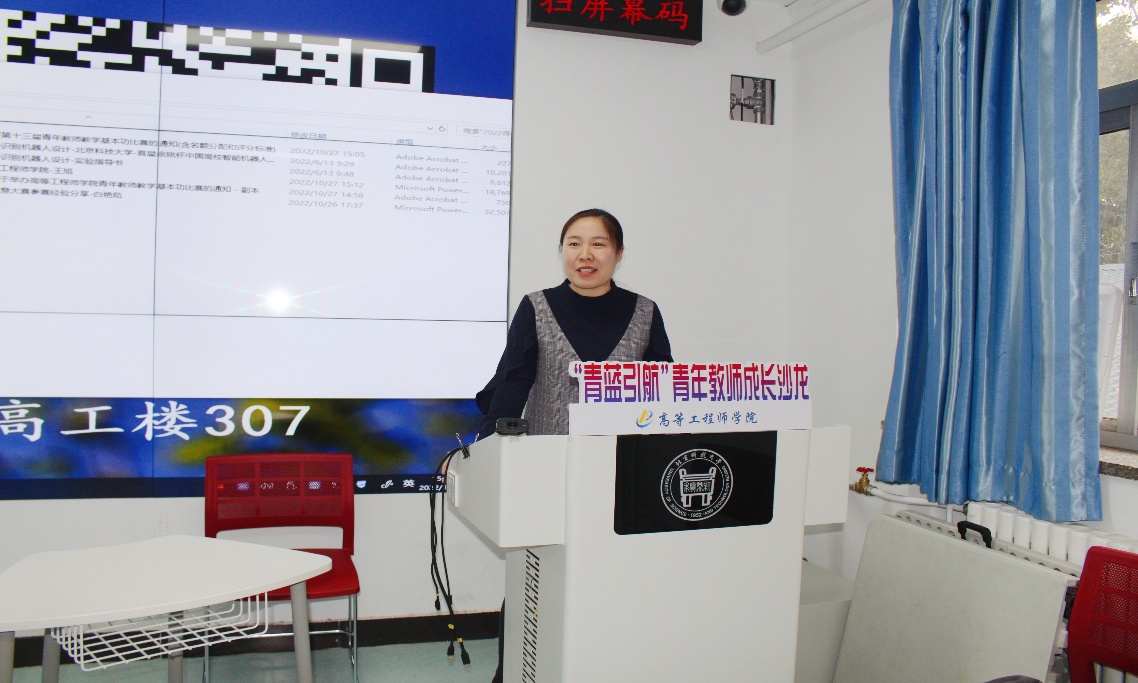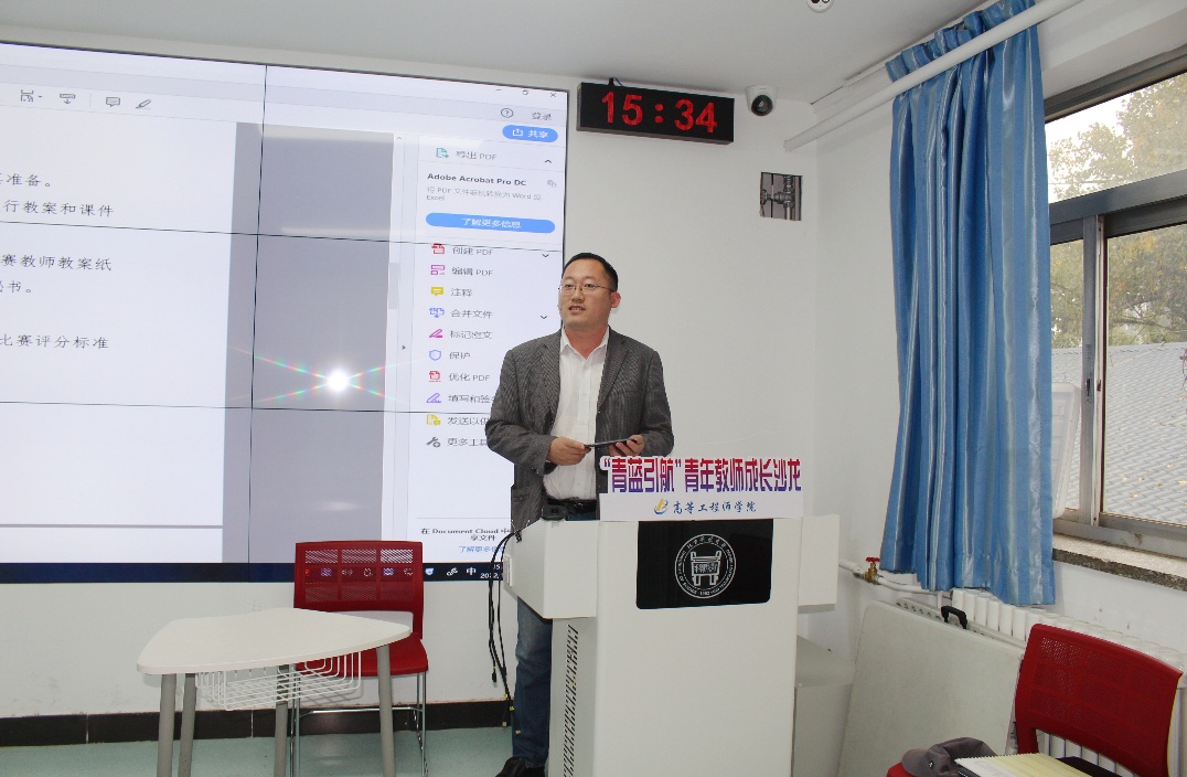 沙龙总共分为三个主题。首先由学院青年教师团工委书记许文婧介绍了第十三届青年教师教学基本功比赛的通知,并根据学校通知宣读了学院预赛通知。副经理刘征建就比赛进行了备赛指导。刘经理曾多次参加教学基本功比赛并取得好名次,在备赛比赛上富有经验,他指出老师备赛时一定要先研读通知要求,注重板书和教学道具的使用,同时要合理分配15分钟的比赛时间并留有一页总结和思考题作为控制时间的手段,还要注意讲授过程中注意互动并合理地将课程思政结合起来,即将参加比赛的老师们听完之后纷纷表示受益匪浅。