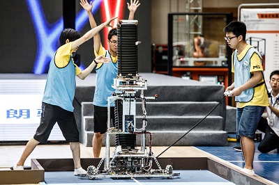 本届大赛以“舞盘雅乐”(源于我国传统礼仪项目“投壶”)为主题,在比赛中,每支参赛队伍的参赛队员需要综合应用机械制图、电子电路、单片机、传感技术、自动控制、图像处理、计算机编程语言、电机拖动等多门学科的知识,设计制作自动机器人。比赛时,双方机器人通过投掷机构,在固定区域向场地内七个远近不同的着陆台投掷飞盘,最先完成飞盘占领全部着陆台的一方记为“完胜”。