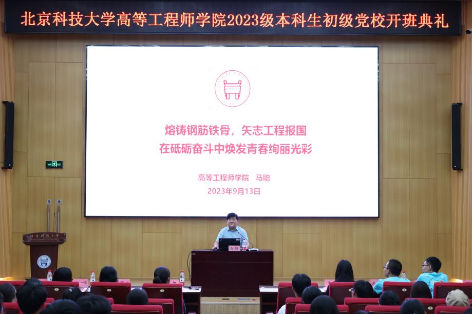 本期初级党校第一讲由马聪做《熔铸钢筋铁骨、矢志工程报国,在砥砺奋斗中焕发青春绚丽光彩》主题讲座。马聪带领全体学员共同学习了习近平总书记给学校的两封重要回信精神,结合校史介绍了学校始终以解决国家重大需求、引领行业技术进步为己任,取得了高质量内涵式发展诸多重大成就,指导同学们落实重要回信精神、夯实思想理论根基,弘扬“学风严谨、崇尚实践”优良传统,诠释“追求卓越、勇于争先”北科精神特质。