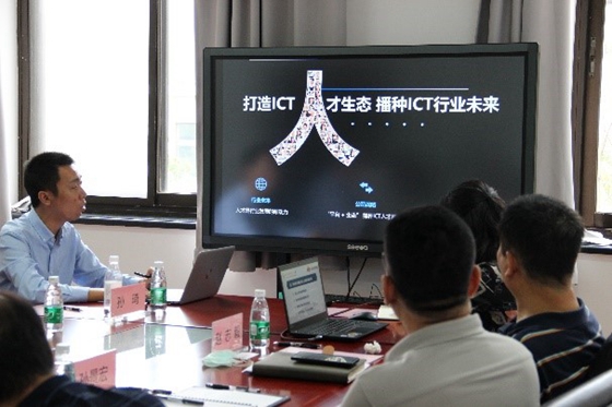 华为的唐伟林部长向学校领导表示感谢,表达希望ICT方面有进一步交流合作的意愿。孙琦全面介绍华为针对高校的合作项目,讲解华为产教融合、校企合作的模式,并对华为鲲鹏处理器和5G两大产业进行介绍。