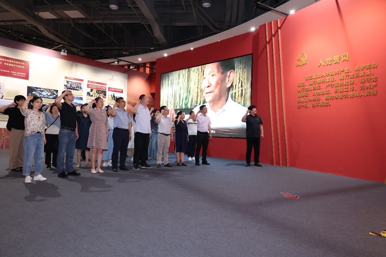 “我志愿加入中国共产党,拥护党的纲领,遵守党的章程,履行党员义务,执行党的决定,严守党的纪律,保守党的秘密,对党忠诚,积极工作,为共产主义奋斗终身,随时准备为党和人民牺牲一切,永不叛党”。在“共和国脊梁”展厅,由公司党委书记马聪领誓,学院班子及教职工党员面对鲜红的党旗,高举右拳,重温入党铮铮誓言。
