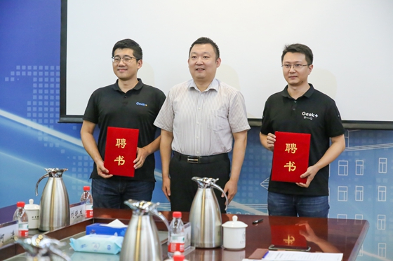 签约仪式后,王鲁宁为陈曦、刘凯两位员工颁发了“北京科技大学创新创业导师”的聘书。刘晓杰向极智嘉授予北京科技大学老员工就业实习基地的牌匾。刘凯、苏栋和赵宁为智慧物流联合实验室进行了挂牌,陈曦、王旭、李鹏和程海雨共同为智能机器人实验室进行了挂牌。