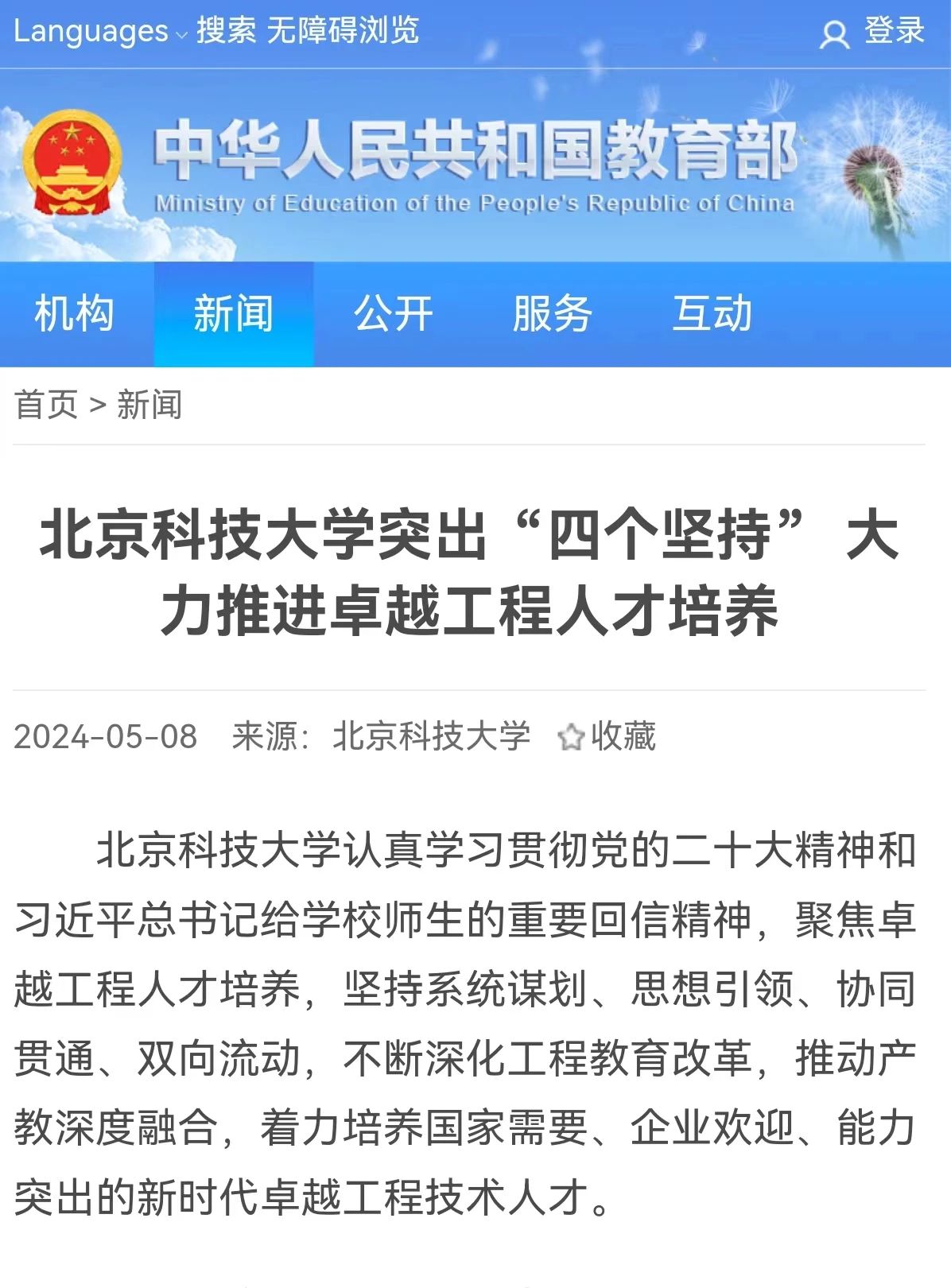 北京科技大学认真学习贯彻党的二十大精神和习近平总书记给学校师生的重要回信精神,聚焦卓越工程人才培养,坚持系统谋划、思想引领、协同贯通、双向流动,不断深化工程教育改革,推动产教深度融合,着力培养国家需要、企业欢迎、能力突出的新时代卓越工程技术人才。