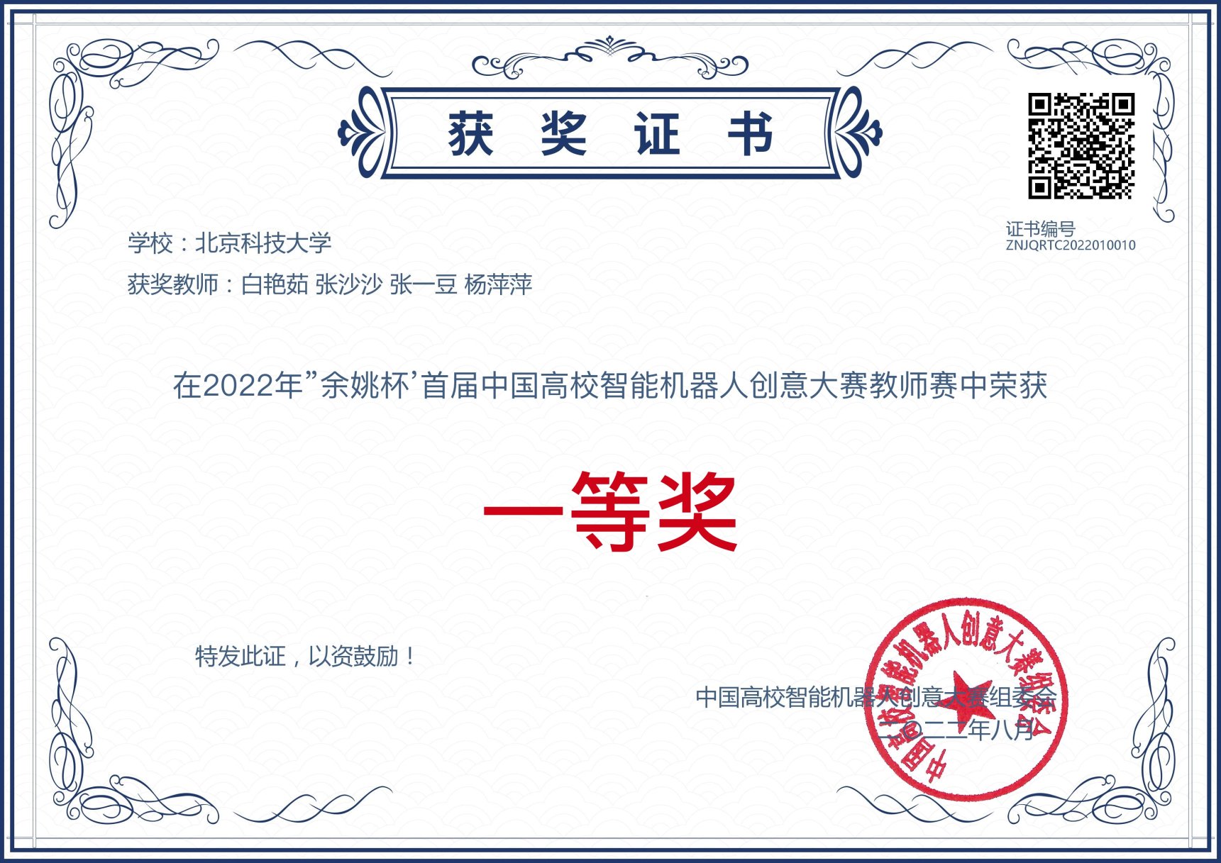 2022年8月28日,第五届中国高校智能机器人创意大赛教师赛总决赛在浙江大学机器人研究院举行。大赛采取评委专家集中在余姚评审,参赛教师线上参赛方式进行。公司电子实习基地白艳茹、张沙沙、张一豆、杨萍萍4位教师组成的“乘风破浪队”获得大赛“机器人实验设计”组决赛一等奖的好成绩。