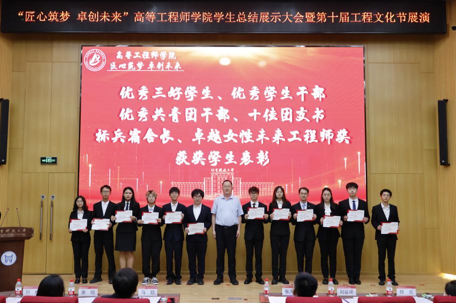 刘娜作总结讲话,她代表学院向取得优异成绩的先进集体和个人,向所有投入智慧和汗水、取得圆满收获的同学表示热烈的祝贺。她带领大家回顾了过去一年学院取得的丰硕成果,同时对同学们提出了三点希望。一要心怀“国之大者”,坚持理想与时代同行,树立具有为国奉献钢筋铁骨的卓越工程师理想;二要追求真才实学,将精进学业、精技强能与行业创新发展、绿色低碳发展和科技强国、制造强国紧密结合,在社会大课堂上施展才华,练就过硬本领;三要加强传承示范,高年级同学做好榜样引领,低年级同学见贤思齐,带领高工学子坚定理想信念,明确人生目标,实现青春梦想。