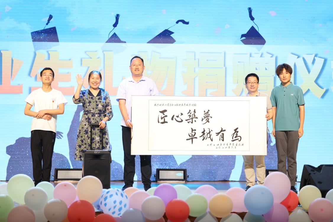 由高工本20级党支部牵头,全体毕业生向学院献上一台漫步者音响和一幅书法。副经理吕庆功、刘征建、刘娜代表学院上台接受毕业生礼物。