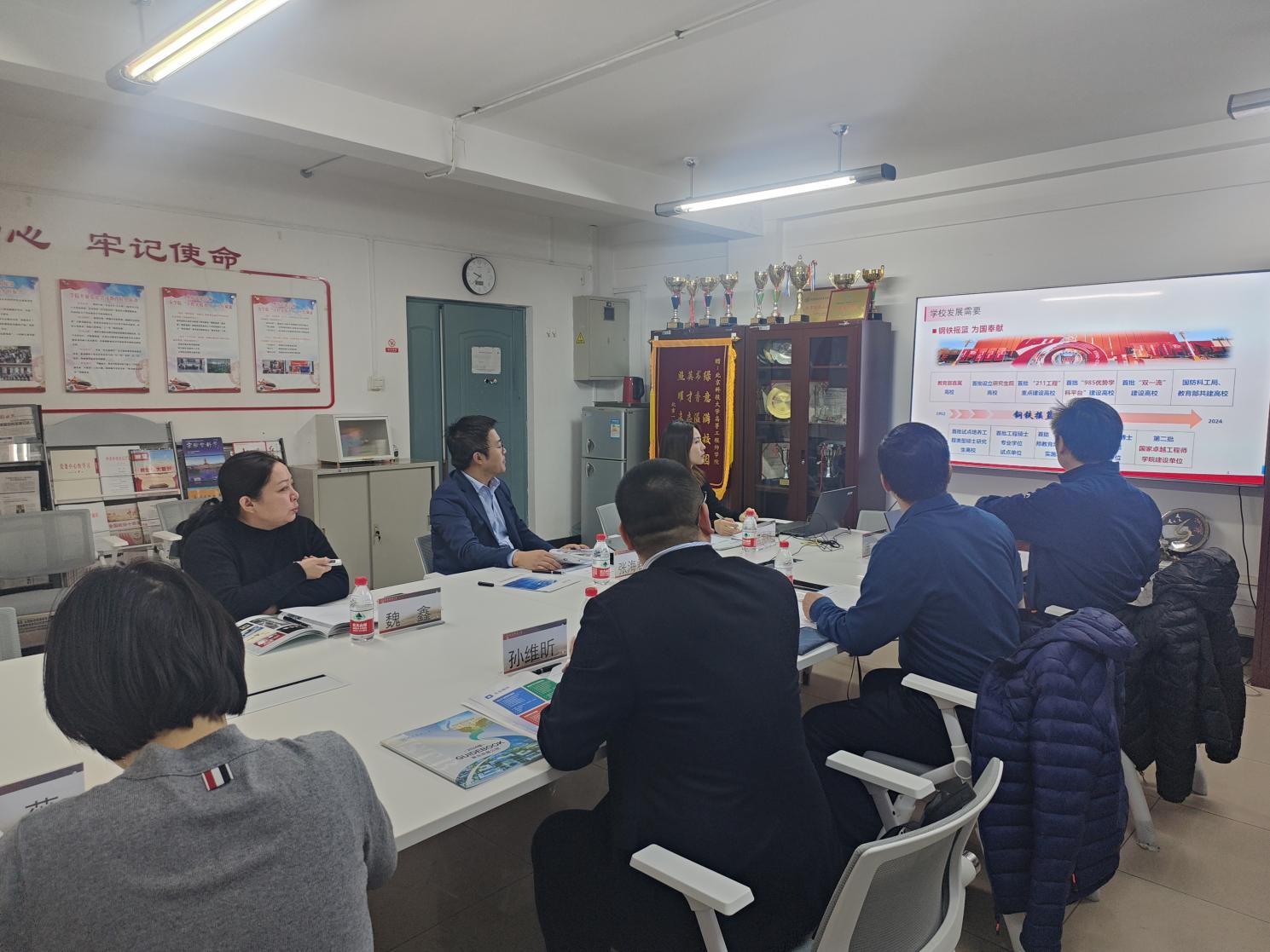 张海君对宫理想一行到访表示热烈欢迎,介绍了北京科技大学的基本情况,魏鑫介绍了学院整体情况和卓越工程师培养改革的举措。孙维昕、宫理想、潘磊分别介绍了一轻控股集团、一轻科技集团的主营业务情况、产业和研究方向和人才需求情况。