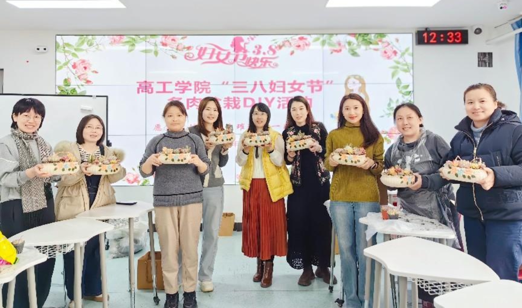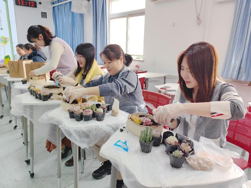女教职工们齐聚一堂,化身“园艺设计师”,从选材搭配到填土栽种,充分发挥想象力和动手能力,以陶艺花盆为画布,将形态各异的萌态多肉、小石子、卡通摆件等元素巧妙结合,打造出独一无二的“迷你花园”。